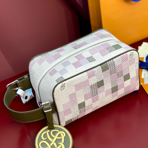 이 제품은 루이비통의 로커 도프 키트 세면 가방입니다. Damoflage 패턴이 적용된 캔버스 소재로 제작되었으며, 독특한 입체적인 디자인이 특징입니다.