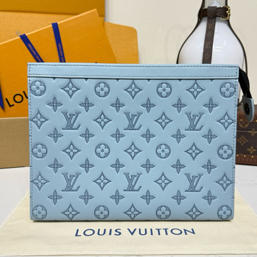 루이비통 포쉐트 보야지 클러치 백은 아이코닉한 모노그램 패턴이 엠보싱 처리된 라이트 블루 컬러의 소가죽으로 제작되어 세련되고 우아한 매력을 선사합니다. 루이 비통의 시그니처 디자인을 현대적으로 재해석한 이 클러치는 부드러운 곡선과 견고한 실루엣이 조화를 이루며, 어떤 스타일에도 고급스러운 포인트를 더해줍니다.