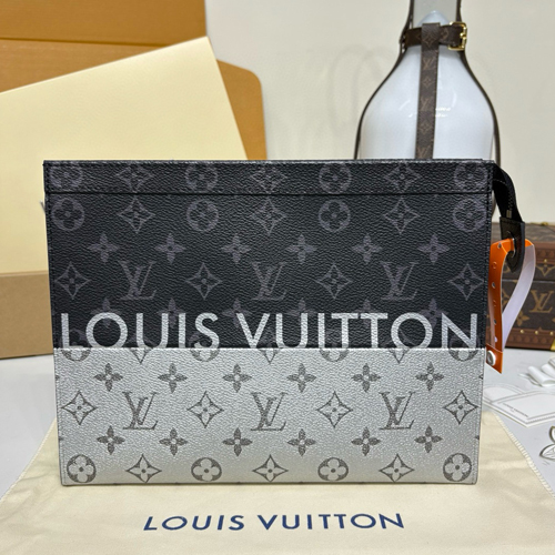루이 비통의 포쉐트 보야주 미디엄 클러치는 모노그램 이클립스 캔버스를 활용한 독특한 스플릿 디자인이 특징입니다. 블랙과 그레이 톤의 모노그램 이클립스 패턴이 절반씩 나뉘어 현대적이고 세련된 미학을 선사하며, 루이 비통 로고가 중앙에 대담하게 배치되어 브랜드 아이덴티티를 강조합니다.