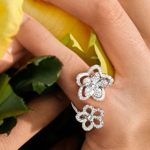 LV의 Wild Flower 시리즈 듀얼 플라워 링은 정교한 디자인과 고급스러운 소재로 제작되었습니다. 50개 한정 상품으로, 섬세한 꽃잎의 입체적인 조형미와 겹쳐진 꽃잎의 독특한 구조가 돋보입니다.