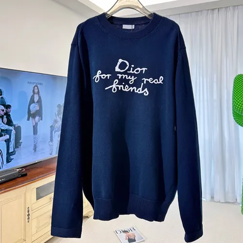 엄선된 고급 면·모·캐시미어 혼방 원사로 제작된 스웨터입니다. 앞면에는 「Dior For My Real Friends」 자수 문구가 독특한 니트 자수 기법으로 새겨져 있어 브랜드 아이덴티티를 강조합니다.