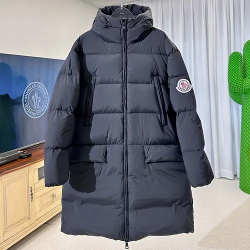 탈부착 가능한 후드와 전면 지퍼·스냅 버튼 이중 여밈으로 방풍 기능을 강화했으며, 깔끔한 실루엣과 브랜드 로고 패치가 포인트가 되는 Moncler 대표 미드롱 아우터입니다.