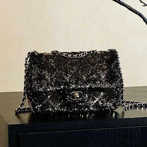 샤넬 퀼팅 시퀸 실버메탈 이브닝 플랩백 25CM #AS4298
