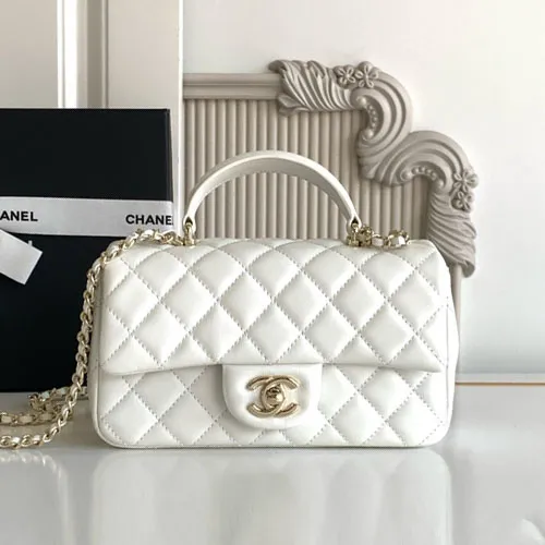 샤넬 CF 뉴미니 램스킨 내장칩 탑핸들 화이트 금장 20CM #AS2431