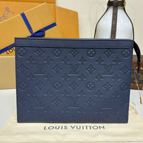 루이 비통 포쉐트 보야지 클러치는 브랜드의 상징적인 모노그램 패턴을 엠보싱 처리한 다크 블루 색상의 특수 코팅 캔버스 소재로 제작되었습니다. 견고하면서도 세련된 디자인이 돋보이며, 모노그램 패턴이 입체적으로 표현되어 고급스러움을 더합니다.