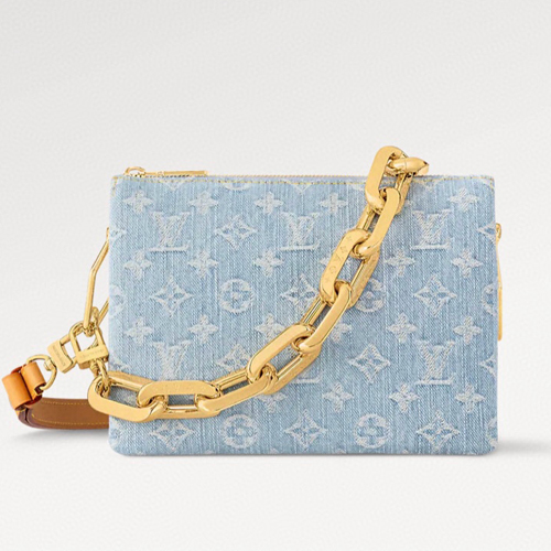 이 제품은 모노그램 데님 패턴을 특징으로 하는 쿠신 BB 백입니다. 면 캔버스에 프린트된 모노그램 패턴은 옅은 푸른색과 흰색의 조화로 시원하고 캐주얼한 느낌을 줍니다.