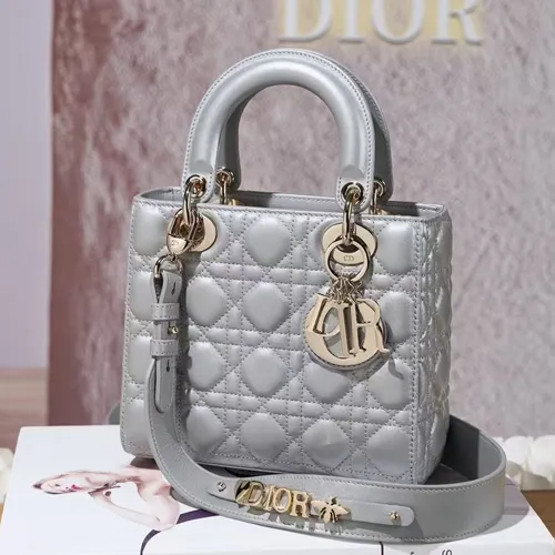연한 골드톤 금속 D.I.O.R. 참 장식이 어우러져 세련된 분위기를 더하며, 탈착 가능한 숄더 스트랩에는 이니셜 참 장식을 더해 개성을 표현할 수 있습니다.