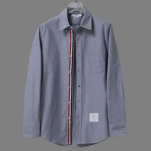 이 셔츠는 TB 스타일의 상징적인 삼색 밴드(빨강·흰색·파랑)가 전면 버튼 라인에 들어가 있으며, 셔츠 하단에는 톰브라운 특유의 라벨이 부착된 디자인입니다. 내직 소재(니트조직 원단)로 제작되어 일반 면 셔츠보다 부드럽고 유연하며, 카라 안쪽 디테일까지 정교하게 마감되었습니다.