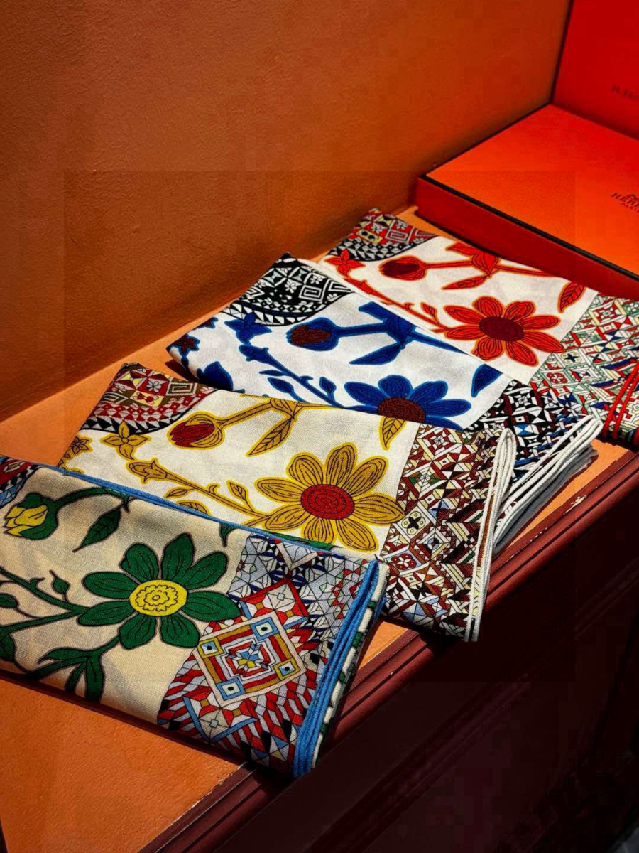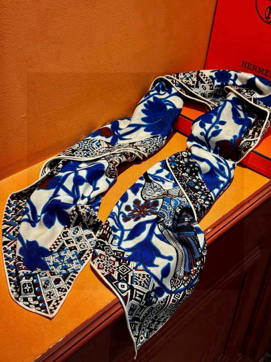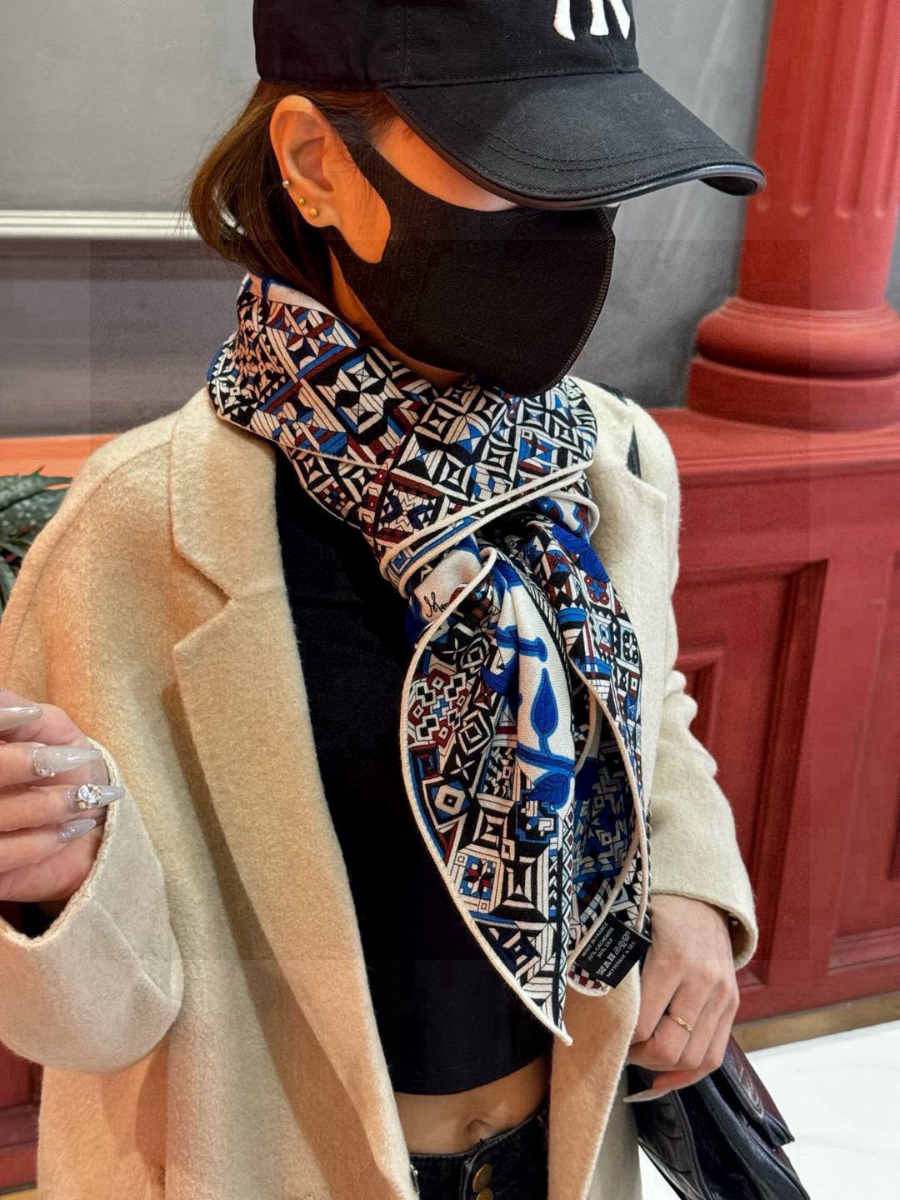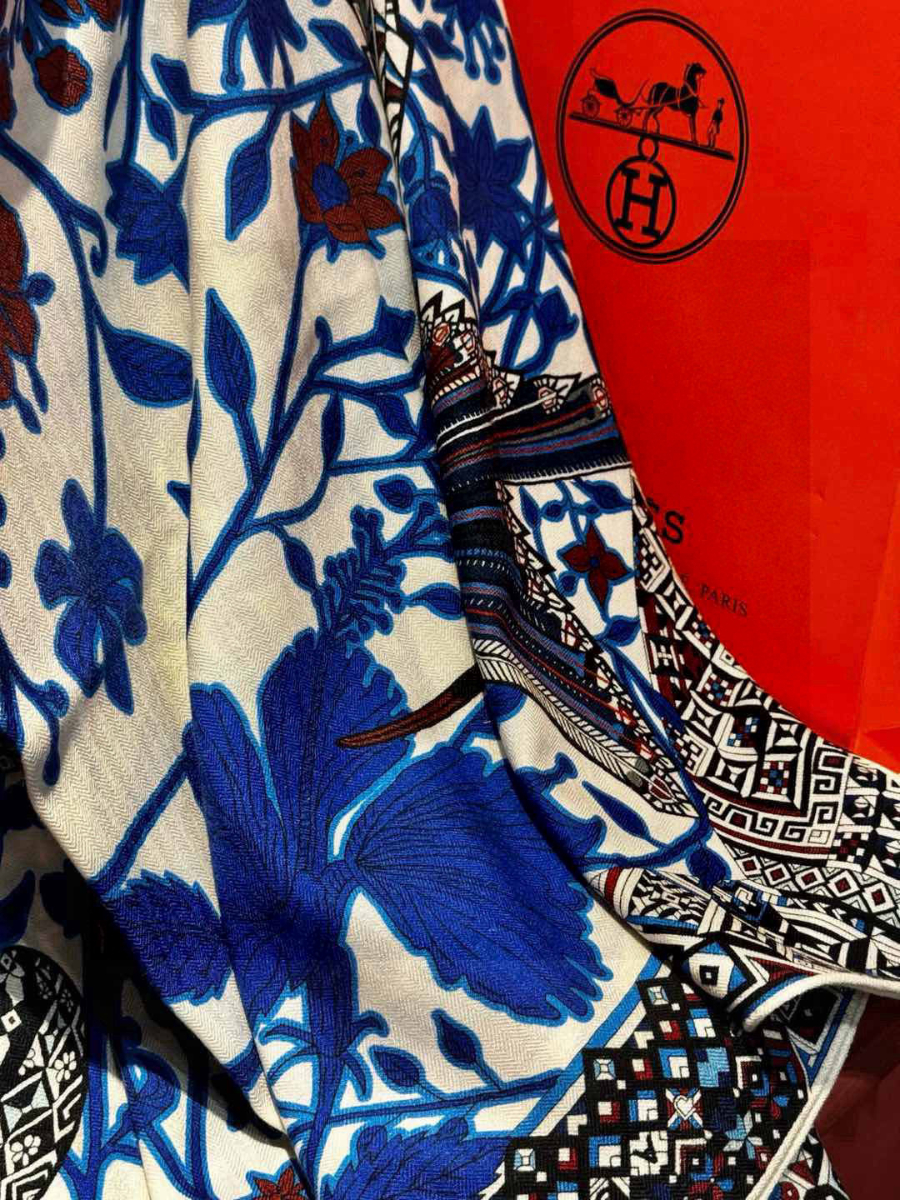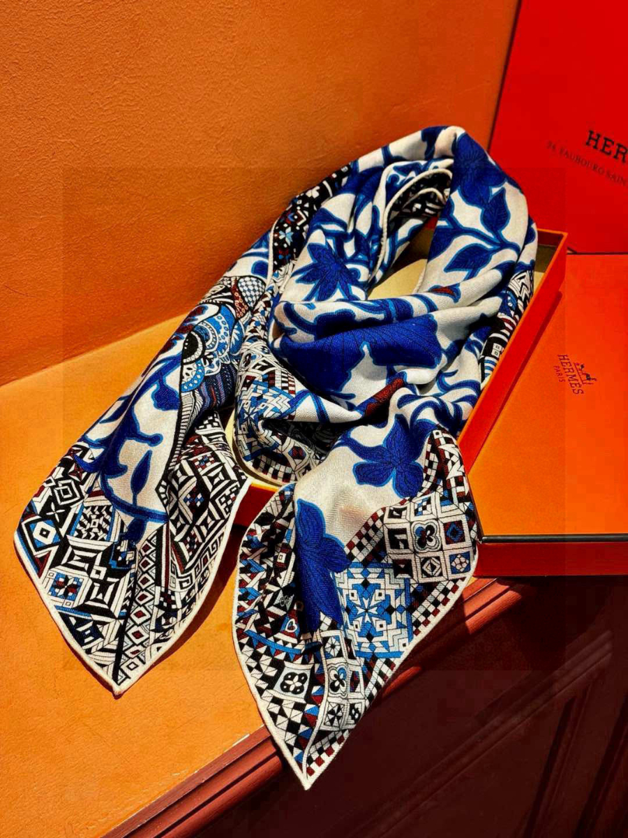 에르메스에서 출시된 양모와 캐시미어 혼방의 스퀘어 스카프입니다. 고급스러운 소재와 독특한 패턴 디자인이 특징이며, 다양한 스타일로 연출할 수 있습니다.