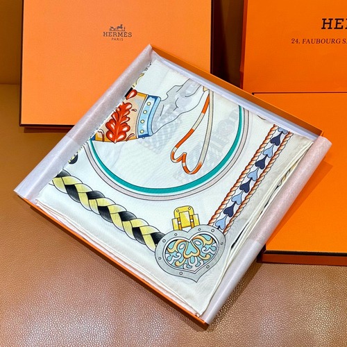 에르메스의 클래식한 90 스카프입니다. 100% 뽕나무 실크 소재로 제작되었으며, 손으로 말아 올린 가장자리가 특징입니다.